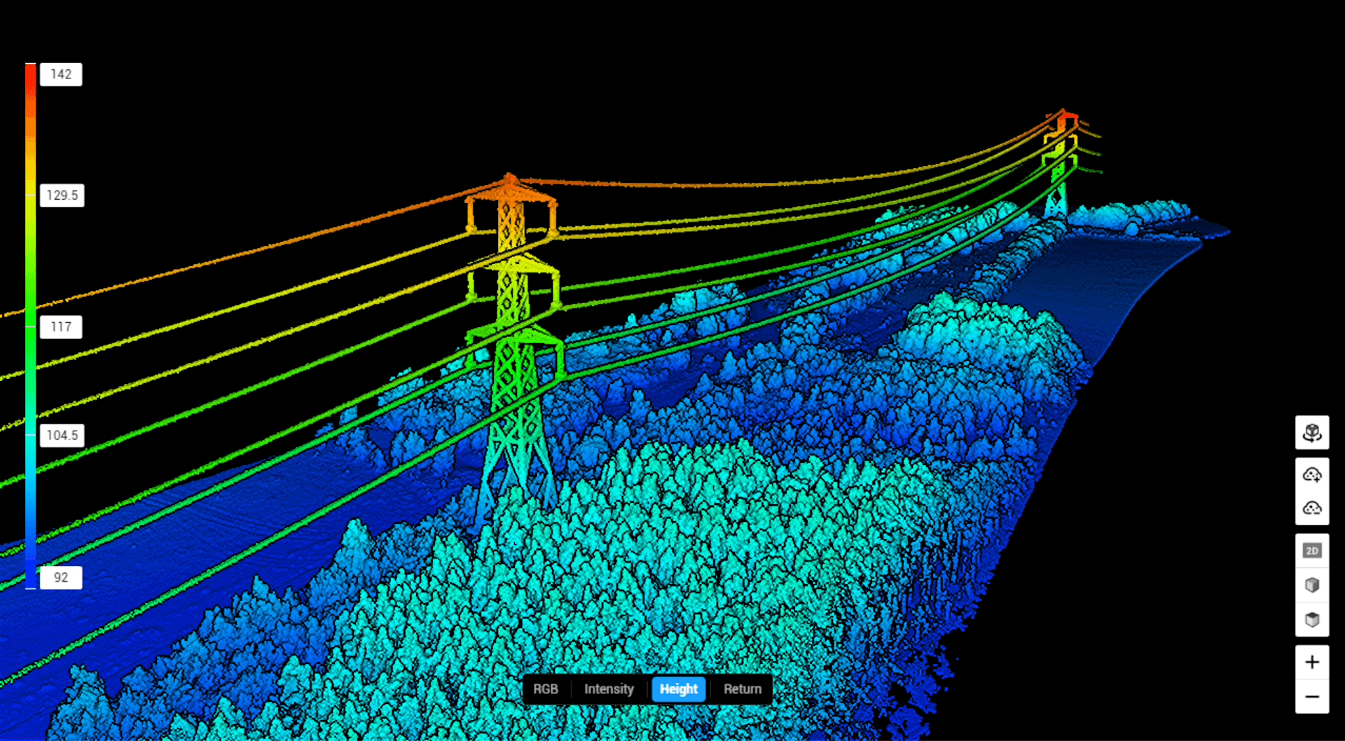 Poles, wires, and tree geometries are clearly distinguishable in 3D.